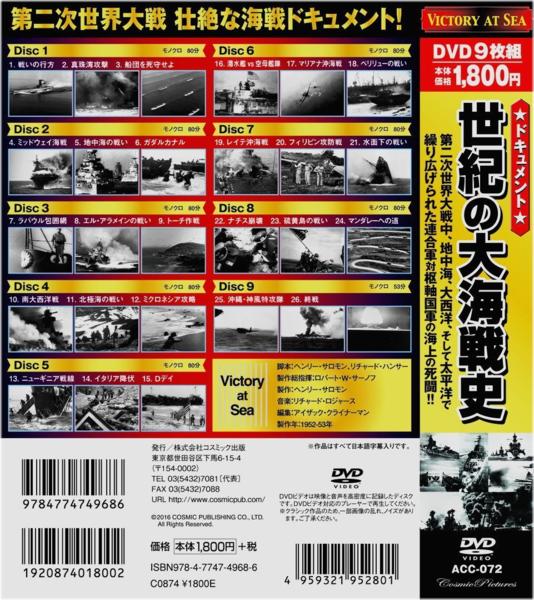 収録内容 1. 戦いの行方 真珠湾攻撃 船団を死守せよ / モノクロ 80分 2. ミッドウェイ海戦 地中海の戦い ガダルカナル / モノクロ 80分 3. ラバウル包囲網 エル・アラメインの戦い トーチ作戦 / モノクロ 80分 4. 南大西洋戦 北極海の戦い ミクロネシア攻略 / モノクロ 80分 5. ニューギニア戦線 イタリア降伏 Dデイ / モノクロ 80分 6. 潜水艦 VS 空母艦隊 マリアナ沖海戦 ペリリューの戦い / モノクロ 80分 7. レイテ沖海戦 フィリピン攻防戦 水面下の戦い / モノクロ 80分 8. ナチス崩壊 硫黄島の戦い マンダレーへの道 / モノクロ 80分 9. 沖縄・神風特攻隊 終戦 / モノクロ 53分 脚本 : ヘンリー・サロモン、リチャード・ハンサー 製作総指揮 : ロバート・W・サーノフ 製作 : ヘンリー・サロモン 音楽 : リチャード・ロジャース 編集 : アイザック・クライナーマン 製作年 : 1952-53年 ※ 収録作品はすべて日本語字幕入りです。