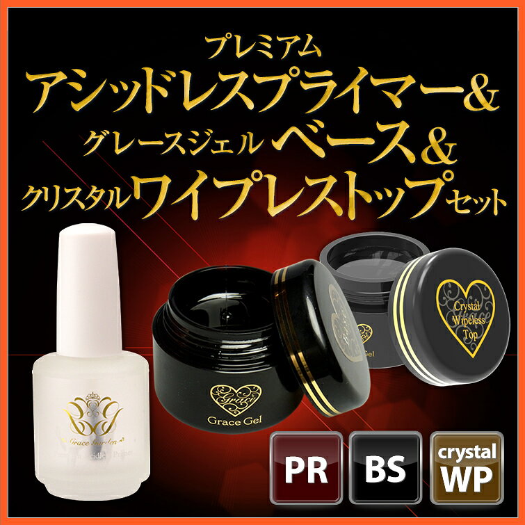 ●ゆうメール不可●プレミアムアシッドレスプライマーをご使用いただくことで持ちが断然アップ!!!プレミアムアシッドレスプライマー&グレースジェルベース&クリスタルワイプレストップセット